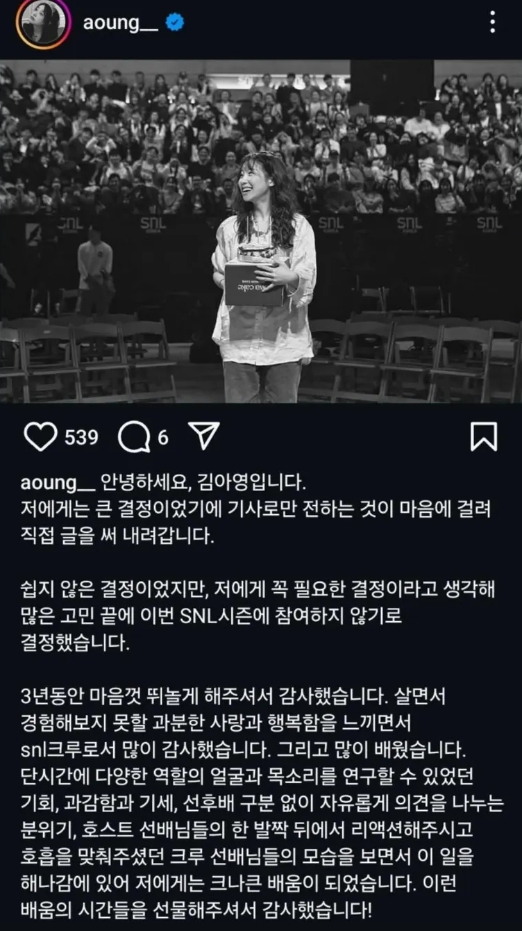 김아영 씨는 지난 14일, 자신의 SNS를 통해 직접 하차 소식을 전했습니다. 그녀는 "쉽지 않은 결정이었지만, 제게 꼭 필요한 결정이라고 생각해 많은 고민 끝에 이번 SNL 시즌에 참여하지 않기로 결정했다"며 솔직한 심경을 밝혔습니다. 이어 "SNL에서 보낸 3년여 간의 시간은 제 인생의 소중한 자산이 됐다"며 감사 인사를 전하는 한편, "아쉬움과 함께 솔직하게 두려운 마음도 들지만, 그만큼 제가 더 성장할 기회라는 생각도 든다. 여태 해왔던 것처럼 차근차근 저만의 길을 만들어 가보겠다"며 앞으로의 활동에 대한 기대감을 높였습니다.